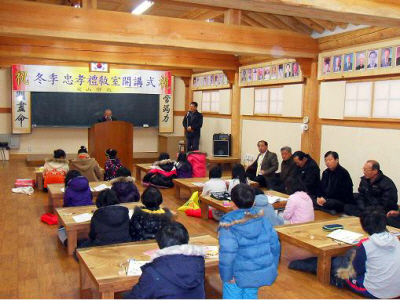 <p class="HStyle0" style="LINE-HEIGHT: 180%"><span style="FONT-WEIGHT: bold; FONT-SIZE: 14pt; LINE-HEIGHT: 180%; FONT-FAMILY: 한양신명조,한컴돋움"><span style="FONT-SIZE: small; FONT-FAMILY: Arial">옛 선현의 지혜와 예절 배워요</span></span></p> <p class="HStyle0" style="LINE-HEIGHT: 180%"><span style="FONT-WEIGHT: bold; FONT-SIZE: 14pt; LINE-HEIGHT: 180%; FONT-FAMILY: 한양신명조,한컴돋움"><span style="FONT-SIZE: small; FONT-FAMILY: Arial">-청양군 정산향교 충효예교실 개강</span></span></p> <p class="HStyle0" style="LINE-HEIGHT: 180%"> </p> <p class="HStyle0" style="LINE-HEIGHT: 180%"><span style="FONT-SIZE: 14pt; LINE-HEIGHT: 180%; FONT-FAMILY: 한양신명조,한컴돋움"><span style="FONT-SIZE: small; FONT-FAMILY: Arial">청양군 정산향교(전교 윤병현)는 향교 내 전통문화전수관에서 지난 28일 각 기관단체장, 학생 등 50여명이 참석한 가운데 ‘2009 동계 충효예교실’ 개강식을 가졌다.</span></span></p> <p class="HStyle0" style="LINE-HEIGHT: 180%"><span style="FONT-SIZE: 14pt; LINE-HEIGHT: 180%; FONT-FAMILY: 한양신명조,한컴돋움"><span style="FONT-SIZE: small; FONT-FAMILY: Arial">이번 충효예교실은 28일부터 내년 1월 8일까지 2주간에 걸쳐 운영되며 30명의 학생들이 참여한 가운데 사자소학, 전통예절, 명심보감 등 옛 선현의 가르침을 중심으로 인성함양에 힘쓰게 된다. 윤병현 전교는 “추운 날씨에 고생이 많겠지만 이번 충효예교실은 학생들에겐 진정한 충성과 효도, 그리고 예절을 배울 수 있는 소중한 시간이 될 것”이라며 “짧은 기간이지만 우리의 전통예절이 얼마나 아름답고 소중한 것인지를 깨달을 수 있는 계기가 되길 바란다”고 당부했다.</span></span></p> <p class="HStyle0" style="LINE-HEIGHT: 180%"><span style="FONT-SIZE: 14pt; LINE-HEIGHT: 180%; FONT-FAMILY: 한양신명조,한컴돋움"><span style="FONT-SIZE: small; FONT-FAMILY: Arial">한편, 정산향교 충효예교실은 매년 2회씩 운영되고 있으며, 방학 중에도 인성함양을 위한 학부모들의 역할을 대신해주고 있어 주민들에게 좋은 평가를 받고 있다.</span></span></p> <p></p> |