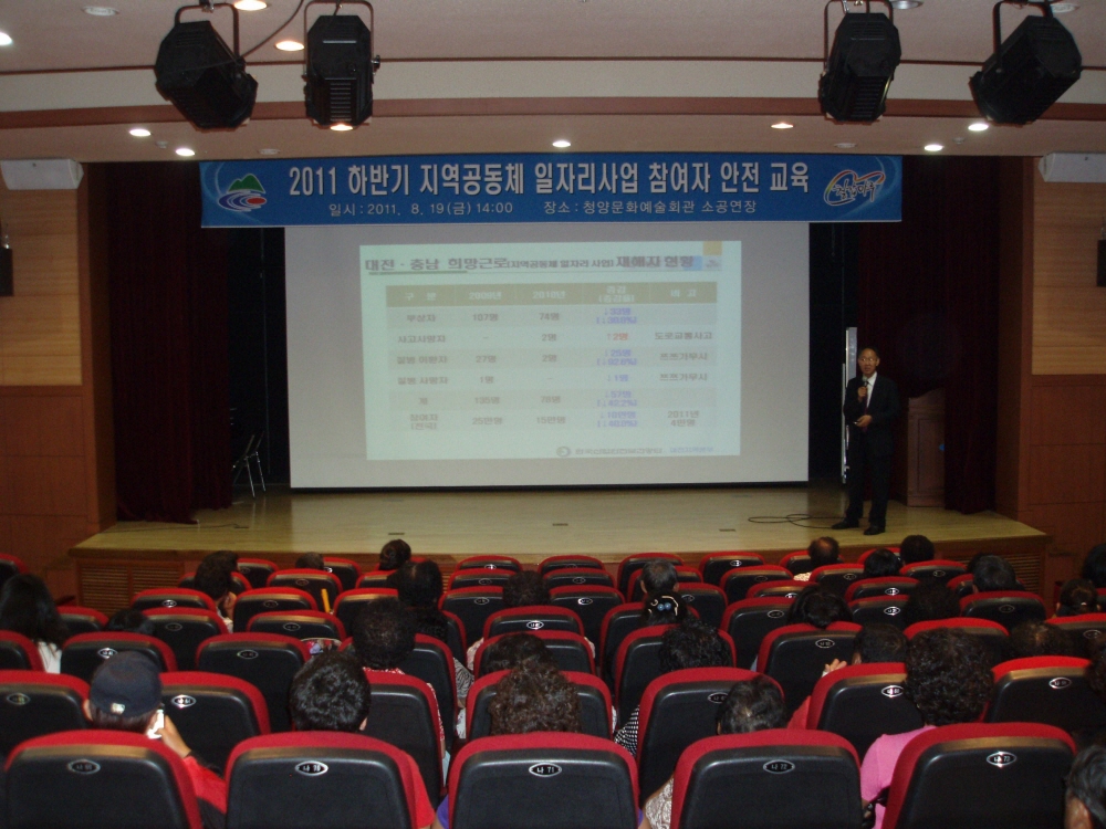 지역공동체 일자리사업 참여자 대상 청양군(군수 이석화)은 지난 19일 청양문화예술회관 소공연장에서 지역공동체 일자리, 청년스마터육성사업 및 공공근로사업 참여자, 사업 담당 공무원 등 70여명이 참석한 가운데 안전교육을 실시했다. 이날 교육은 한국산업안전보건공단 윤석재 과장의 강의를 통해 참여자의 안전을 위한 재해예방요령과 매일 작업 개시 전 사업장 지도ㆍ감독, 건강관리, 사고예방법 등 안전 교육을 실시해 업무상 재해가 한 건도 발생하지 않도록 참석자들의 주의를 환기시켰다. 이석화 청양군수는 “2010년 대비 일자리사업 국․도비 보조금이 60%나 감소해 사업추진에 어려움이 있었으나 우리군은 하반기에 순수군비로만 2억 8천만원을 투입해 135명의 일자리를 추가로 창출할 계획”이며 오늘 안전교육을 잘 받으셔서 여러분들 모두가 안전사고 예방에 각별히 유의해 주시기 바란다고 말했다. 한편, 청양군은 앞으로도 취업을 희망하는 사회취약계층을 대상으로 지역공동체의 회복을 촉진할 수 있는 일자리를 제공하고 지역의 소득창출 및 사회참여의 기회를 높일 계획이다. |