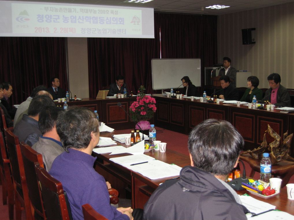 청양군농업기술센터는 지난 28일 2013년 ‘청양 대 도약의 해’를 맞아 부자농촌․억대부농 육성을 위해 농업관련기관, 농업인단체장, 독농가 등 22여명이 참석한 가운데 농업산학협동심의회를 개최해 고품격의 농업기술 시범사업을 심의․확정했다.