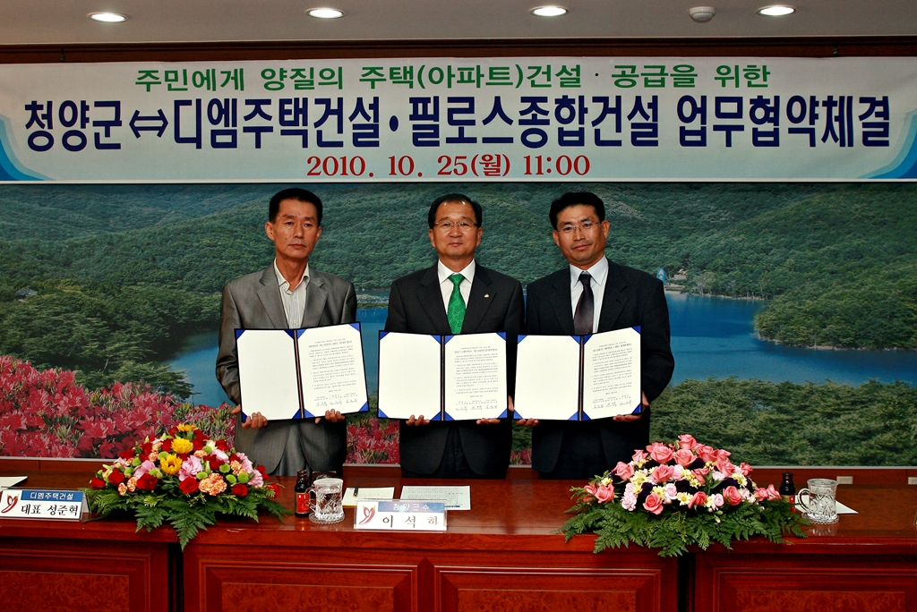 <p> <span style="FONT-WEIGHT: bold; FONT-SIZE: 16pt; LINE-HEIGHT: 160%; FONT-FAMILY: 한양신명조,한컴돋움">- 청양군, 디엠주택건설ㆍ필로스종합건설과 업무협약 체결</span></p>