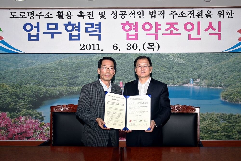 청양군↔청양우체국 새주소 업무 협약 청양군(군수 이석화)이 100년 앞을 내다보고 추진하는 새주소 사업의 성공을 위해 지난달 30일 군청2층 상황실에서 청양우체국(국장 한선희)과 업무협약(MOU)을 체결했다. 이번 협약으로 양 기관은 유기적 업무협조를 위한 실무협의체 구성, 주소에 대한 행정자료 공유, 집배원을 통한 소외계층 홍보 및 시설물 확인 등 새주소 조기정착 및 정확한 우편시스템 구축을 위해 상호 협력하게 된다. 이석화 군수는 “우체국과 군청은 적극적인 업무 협조체계를 유지해 군민에게 불편함이 없도록 해야 한다”며 새주소에 대한 중요성을 강조했다. 이어 한선희 우체국장은 “모든 자료를 공유해 군민 편의를 도모하는데 업무에 만전을 기하겠다”고 말했다. 한편, 앞으로 양 기관은 2014년 1월 1일 도로명주소 전면사용을 1차 목표로 ‘찾아가는 새주소 홍보관’을 운영하고 마을 반상회, 마을 회의 등 크고 작은 행사에 참석해 새주소 조기정착을 위해 노력할 것이라고 밝혔다. |