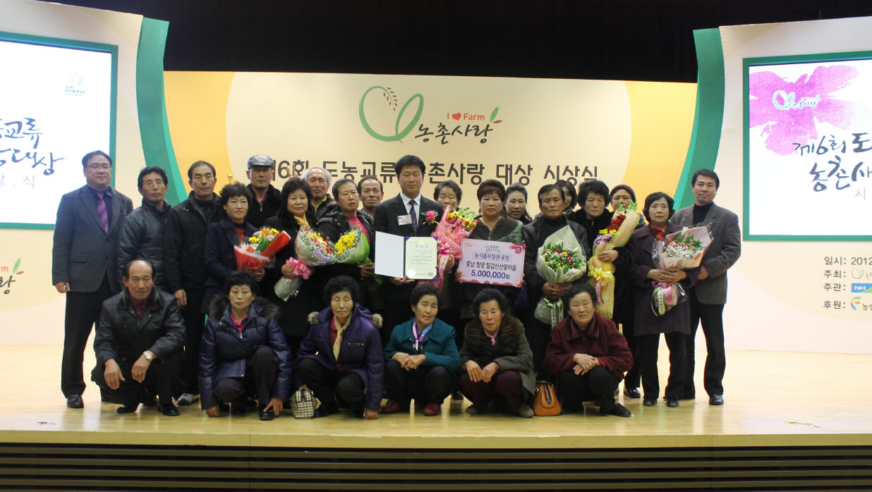 - 농림수산식품부장관상, 마을발전기금 5백만원 수상 대치면 광금리의 칠갑산산꽃마을은 지난 17일 농협중앙회 대강당에서 (사)농촌사랑 범국민운동본부가 주최하고 NH농협과 농림수산식품부가 주관․후원한 제6회 도농교류 농촌사랑대상 마을부문에서 은상을 수상했다. 칠갑산산꽃마을은 지난해 체험방문객 2천명 유치, 도농 교류실적 15억원 달성, 도시민 귀농자 3가구를 정주․유치시켰으며, 다양한 도농교류 활동을 전개 하고 인근 칠갑산 관광명소와 연계한 다양한 프로그램 운영 등에서 좋은 평가를 받아 농림수산식품부 장관 표창과 함께 마을발전 기금 500만원을 받았다. 칠갑산 산꽃마을의 장광석 대표는 “그동안 산꽃마을을 방문해 주신 모든분들과 함께 땀흘려 주신 마을주민들께 감사 드린다”며 앞으로, 도․농교류 활동의 품격을 높이고 내실화를 기해 전국 최고의 아름다운 산꽃마을로 만들겠다는 강한 자신감을 보였다. 칠갑산 산꽃마을은 2006년 녹색농촌체험 마을로 지정된 이후 다양한 농촌체험과 농산물 직거래, 1사1촌운동, 칠갑산 산꽃마을 축제 개최 등 전국에서 도농교류 활동의 표준모델로 호평을 받고 있다. |