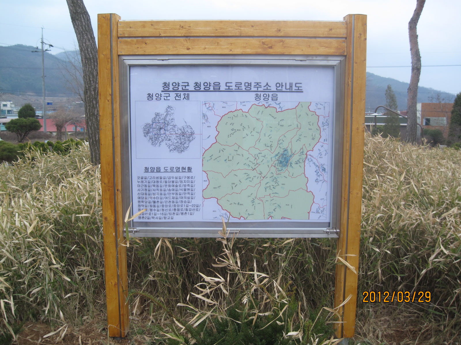 - 청양군 도로명주소 지역안내판 설치 청양군은 2012년 도로명주소 전면 시행됨에 따라 주민들의 이해를 돕기 위해 도로명주소 지역안내판을 제작해 설치했다고 4월 2일 밝혔다. 이번에 설치한 도로명주소 지역안내판은 높이2.6m, 폭1.5m의 표지판으로 군민들이 자주 방문하는 청양읍사무소 외 4개면사무소에 설치됐다. 도로명주소 안내판을 통하여 주민 및 청양군을 찾는 방문객들에게 목적지를 보다 쉽게 찾아갈 수 있도록 편의를 제공하고, 도로명주소의 혼란을 최소화하는 한편, 도로명주소를 쉽게 접하여 활용과 생활화 제고에 크게 기여 할 것으로 보인다. 군 관계자는 “내년 안내판 미설치 지역 5개면에 도로명주소 지역안내판을 추가 설치할 계획”이라며 “도로명주소가 조기에 정착될 수 있도록 군민 모두가 주인의식을 갖고 각종 시설물은 물론 건물번호판 훼손과 망실에 대하여 각별히 관심을 가져달라”고 당부했다. 도로명주소 병행사용 기간은 2013년 12월 31일 까지이며 전면 사용은 2014년 1월 1일 이후이다. 전면 사용이 시작되면 도로명주소만 사용해야 한다. |