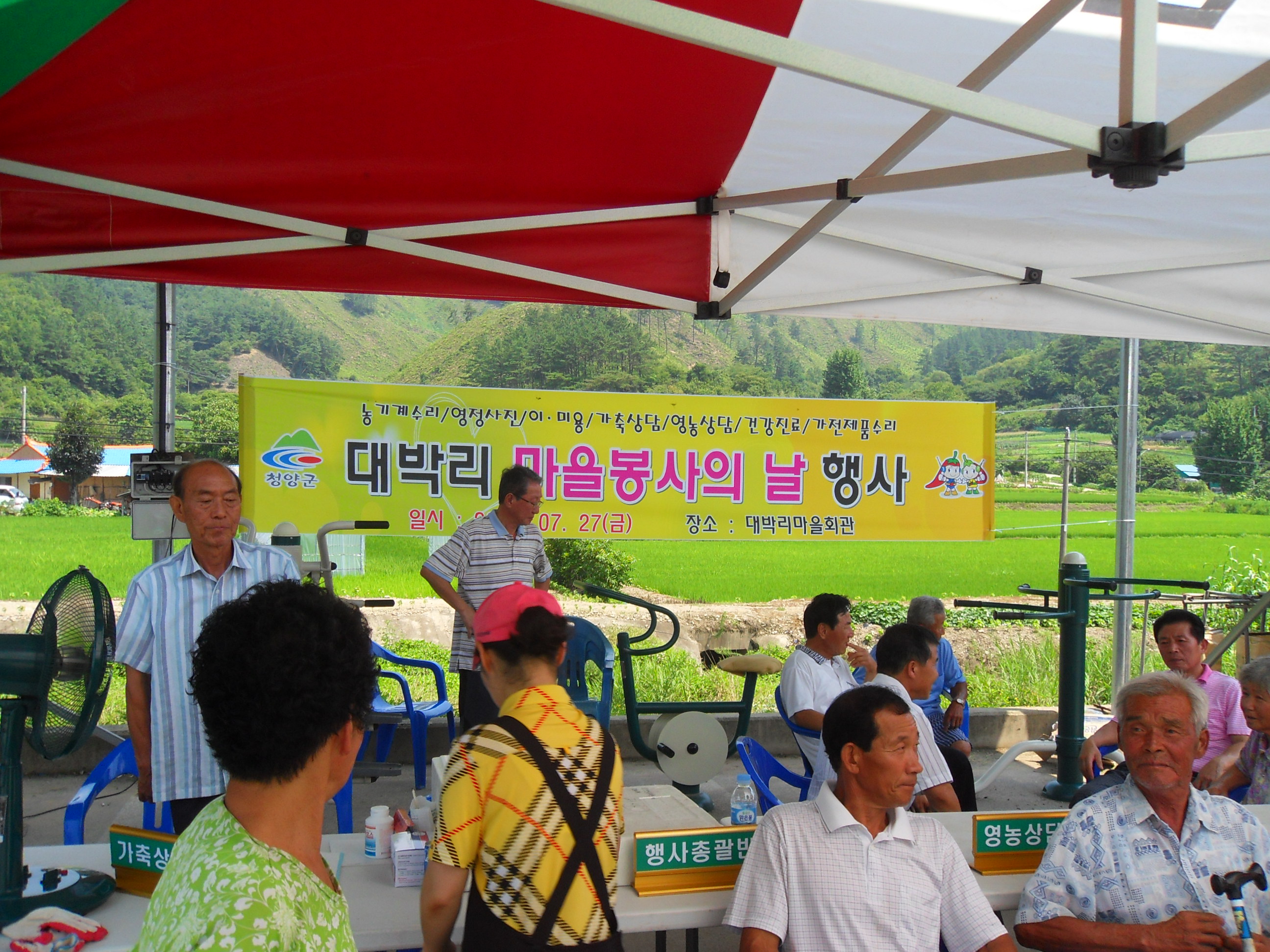 청양군 정산면 대박리는 지난 27일 자원봉사자, 지역 주민, 공무원 등 150여명이 참석한 가운데 대박리 마을회관에서 ‘마을봉사의 날’행사를 가졌다. 이날 행사는 가축상담, 건강검진, 이ㆍ미용, 농기계수리, 가로등수리, 가전제품수리, 효도사진촬영 등 그동안 사진관이나 이‧미용실 이용이 불편하였던 주민들에게 봉사 및 감동행정을 실천하는 계기가 됐다. 또한, 어렵게 사시는 가정에 도배 및 장판을 교체하는 등 훈훈한 봉사활동을 펼쳤다. 류인구 대박리 이장은 “무더운 날씨로 무사히 행사를 치를 수 있을까 걱정이 많았는데 많은 자원봉사자의 손길로 무사히 행사를 마칠 수 있었다며 이런 좋은 행사가 우리 마을에서 실시되어 많은 주민이 쉽게 혜택을 볼 수 있어 좋았고, 주민들이 오늘 행사도 같이 준비하며 화합과 친목을 도모하는 계기가 되어 마을로서도 참 고마운 행사였다”고 말했다. |
