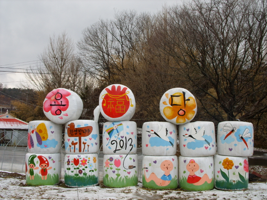 화성면 용당리 마을 입구에 볏짚원형 곤포사일리지를 이용한 그림이 주민들 사이에 화제를 모으고 있다.