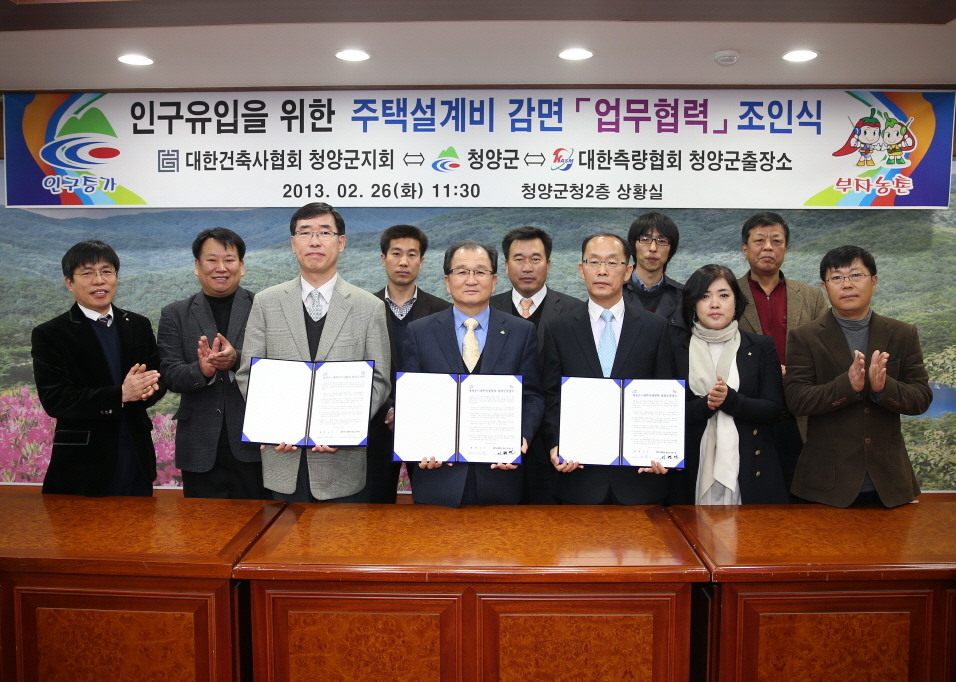 청양군은 지난 26일 대한건축사협회 청양군지회 5개업소 및 대한측량협회 청양군출장소 4개 업소와 청양군에 인구유입을 위한 단독주택 설계비 감면 ‘업무협약’을 체결하고 오는 3월 1일부터 시행키로 했다.