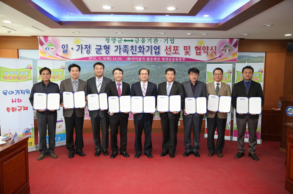 청양군은 군의 최우선 과제인 저출산 극복과 일·가정 균형 기업문화 조성을 위해 100인이상 기업 7개소와 ‘가족친화기업 선포 및 협약’과 가족친화기업에 대한 인센티브 제공을 위한 NH농협은행청양군지부와 MOU를 체결했다.