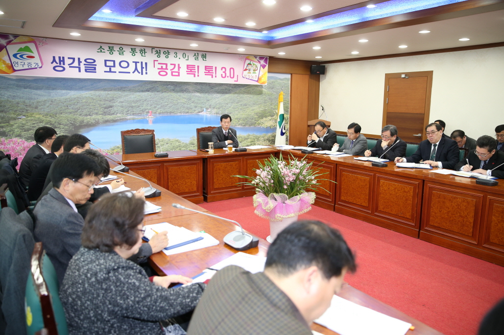 ‘공감 톡!톡! 3.0’은 군정 주요 현안사항에 대하여 매주 월요일 확대간부회의 시 실·과장, 직속기관장, 읍·면장 및 주무담당 등이 토론을 거쳐 의견을 모으는 방식으로 그 동안 추진해 오던 회의의 틀을 확 바꿔 새로운 모형의 회의 문화를 정착시켜 나가기 위한 전략이다. 지난 27일 정송 청양군수 권한대행을 비롯한 50여명이 참석한 가운데 처음 시작한 회의는 30분을 넘기지 않도록 모래시계 전략회의로 진행했고 부서별 사전 회의를 거친 제안에 대하여 열띤 토론이 벌어졌다. 이날은 전통시장 활성화 방안에 대하여 토론한 결과 범군민 차원의 추진협의회 구성, 이벤트 행사 및 안내도우미 운영, 청양상품권 군민확대, 재래시장 포인트 적립, 상인 의식개선 및 역량 강화 등 다양한 의견이 제시되었다. 정송 권한대행은 “그동안 관행적으로 해오던 비효율적 방식을 과감히 바꿔나가고 부서별 현안사항에 청양군 공직자 모두가 고민하고 생각을 모아 해결하자는 것에 목적이 있다”며 소통 행정을 강조했다. 청양군은 ‘공감 톡! 톡! 3.0’을 매주 개최하고 제안된 사항에 대하여 부서별 타당성 검토 후 반영하는 스마트한 행정 추진으로 신바람 나는 공직분위기를 확산해 나간다는 방침이다. |