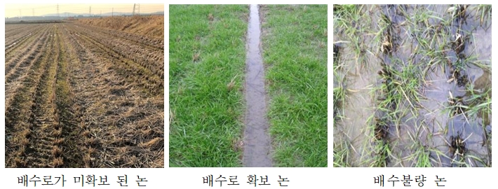 □ 겨울 사료작물을 논에 심을 경우 습해 피해를 막으려면 물 빼는 길(배수로) 정비를 철저히 해야 한다. ○ 논은 밭보다 점토 함량이 많아 습해 피해가 크다. 재배할 때 물이 잘 빠지는 곳을 선택하고, 물 빠짐이 좋다고 하더라도 한 번에 많은 양의 비가 올 경우를 대비해야 한다. ○ 흙에 수분이 많으면 작물의 뿌리가 깊이 뻗지 못하며, 토양 속 산소 부족으로 뿌리의 수분 흡수력이 낮아져 잎이 노랗게 변하면서 말라 죽는다. ○ 특히 청보리와 호밀은 습해에 약하므로 배수로 관리에 각별히 신경을 써야 한다.