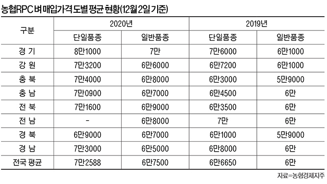 2020년산 벼값이 지난해대비 9~12% 가량 인상된 수준에서 확정가격이 나오고 있다. 특히 쌀값 강세로 인해 출하가격 책정에 유리한 중저가용 일반품종(혼합) 벼값 상승률이 고품질 단일품종보다 높은 것으로 파악되고 있다.