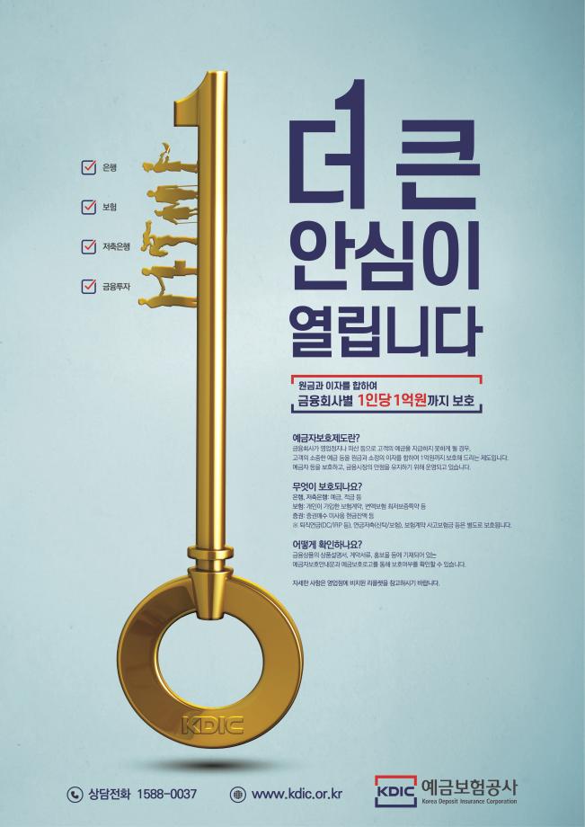 2025년 9월 1일부터 24년만에 예금자보호제도 한도가 기존 5천만원에서 1억원으로 상향됩니다. ------------------ 은행, 보험, 저축은행, 금융투자 더 큰 안심이 열립니다. 원금과 이자를 합하여 금융회사별 1인당 1억원까지 보호 예금자보호제도란? 금융회사가 영업정지나 파산 등으로 고객의 예금을 지급하지 못하게 될 경우, 고객의 소중한 예금 등을 원금과 소정의 이자를 합하여 1억원까지 보호해 드리는 제도입니다. 예금자 등을 보호하고, 금융시장의 안정을 유지하기 위해 운영되고 있습니다. 무엇이 보호되나요? 은행, 저축은행 : 예금, 적금 등 보험 : 개인이 가입한 보험계약, 변액보험 최저보증특약 등 증권: 증권매수 미사용 현금잔액 등 ※ 퇴직연금(DC/IRP 등), 연금저축(신탁/보험), 보험계약 사고보험금 등은 별도로 보호됩니다. 어떻게 확인하나요? 금융상품의 상품설명서, 계약서류, 홍보물 등에 기대되어 있는 예금자보호안내문과 예금보호로고를 통해 보호여부를 확인할 수 있습니다. 자세한 사항은 영업점에 비치된 리플렛을 참고하시기 바랍니다. 상담전화 1588-0037 www.kdic.or.kr 예금보험공사 |