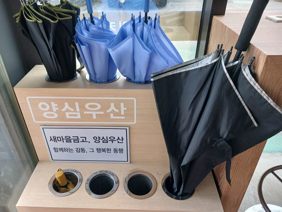 청양 새마을금고에서는 주민들이 자유롭게 우산을 빌려 쓰고, 다음에 다시 반납할 수 있도록 ‘양심우산’을 운영 중이다.