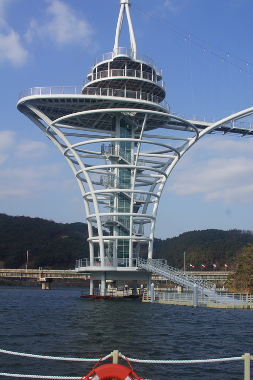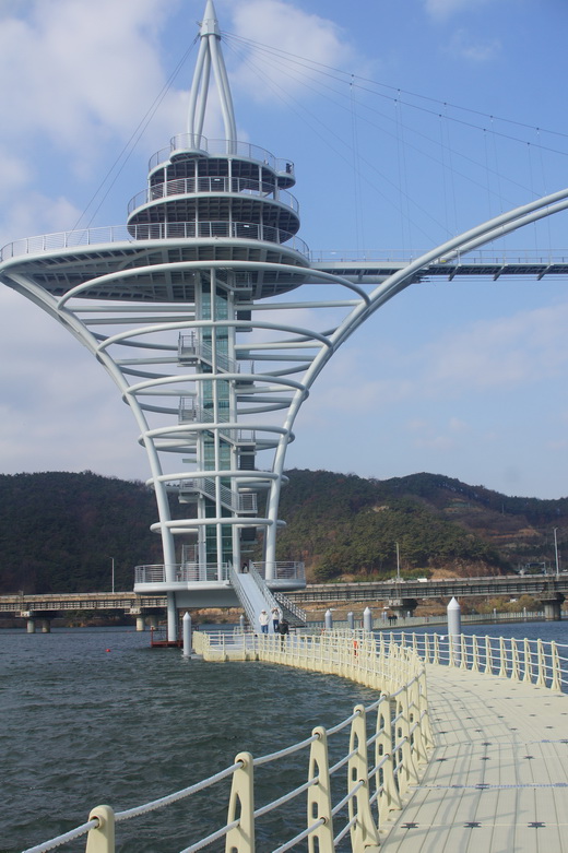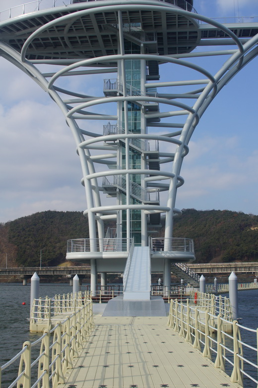 전망대 좌우로 수상 부유구조물이 길처럼 길게 펼쳐져 있는 형상이다.
