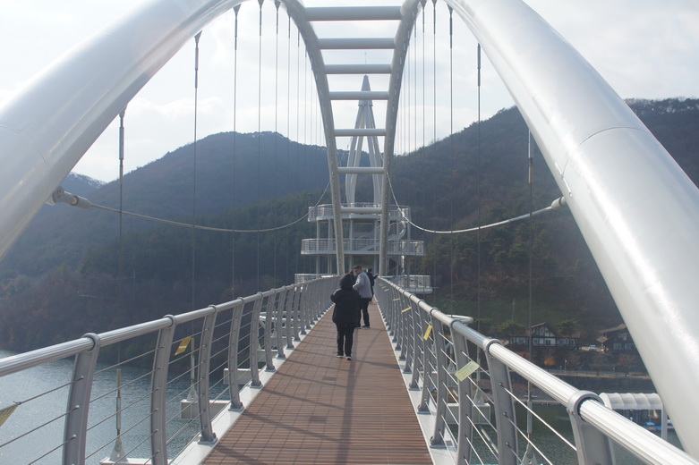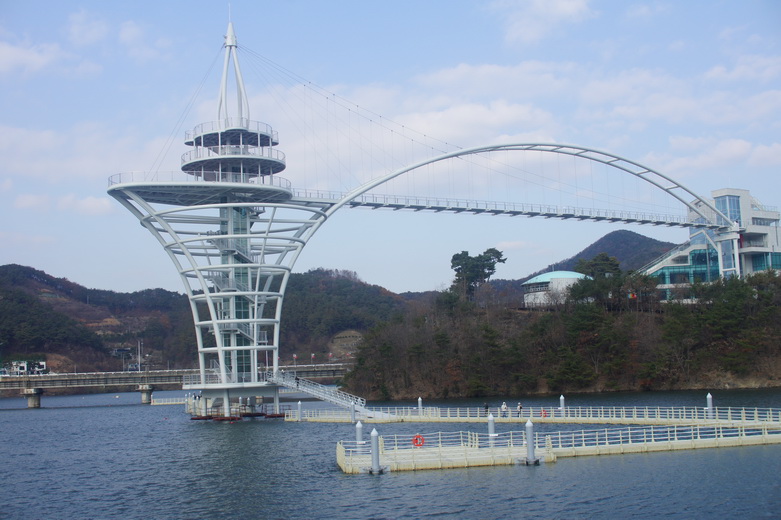 한층을 내려가니 칠갑호 한가운데에 있는 멋진 건물로 연결된 공중통로가 있다.