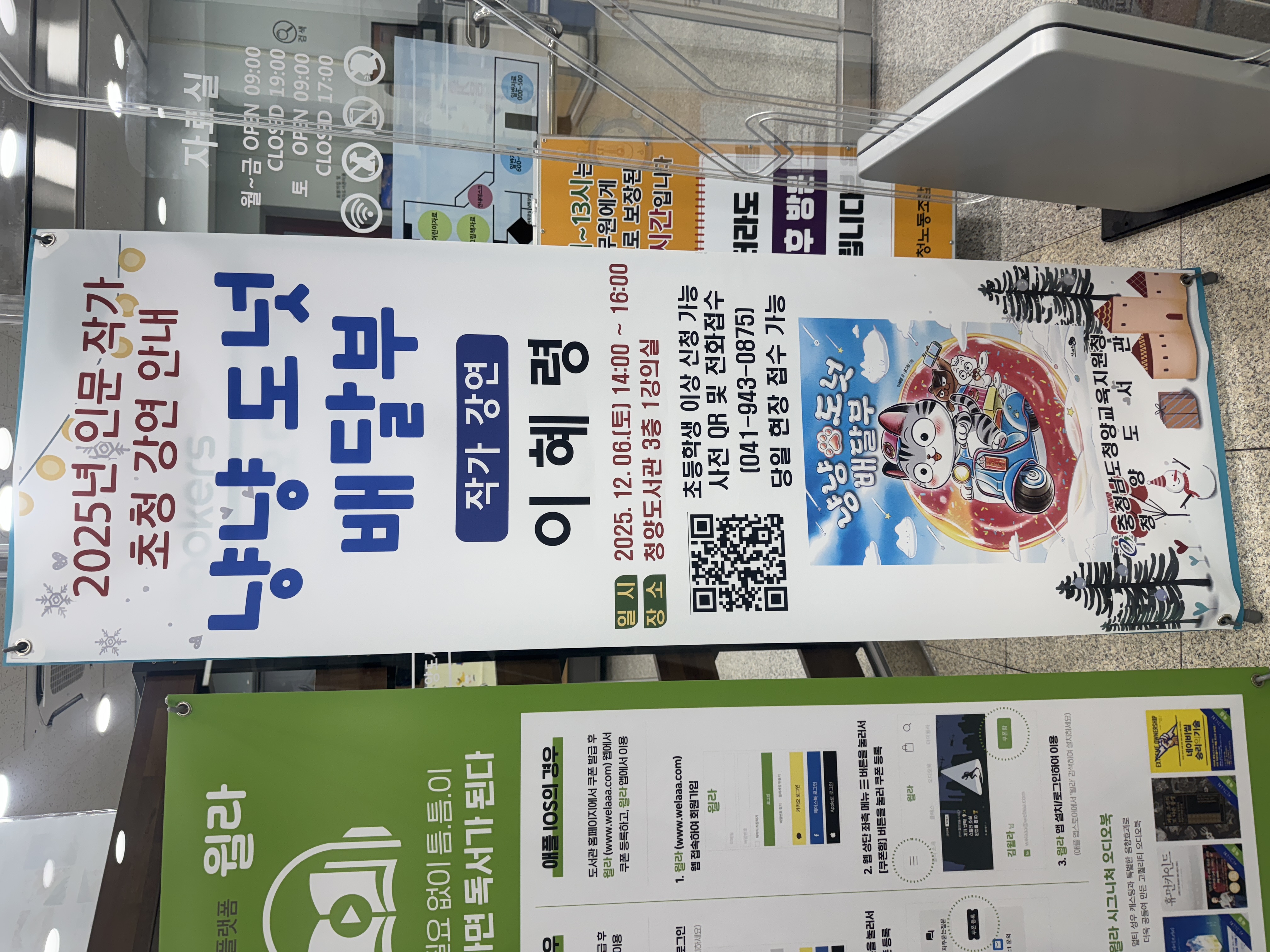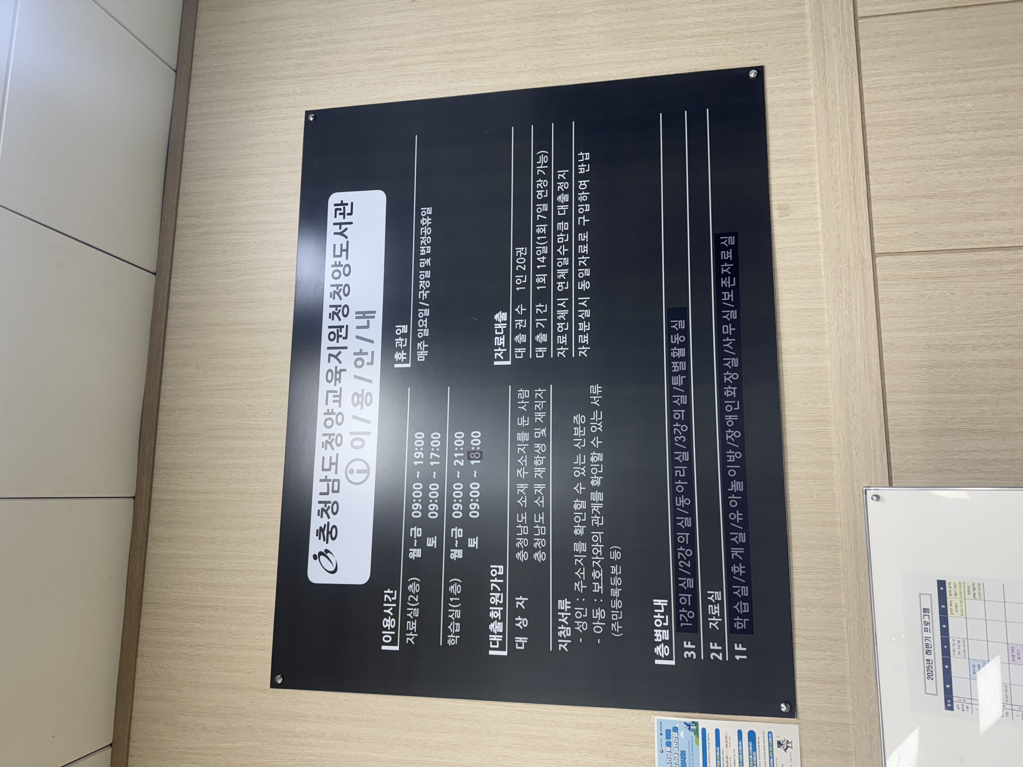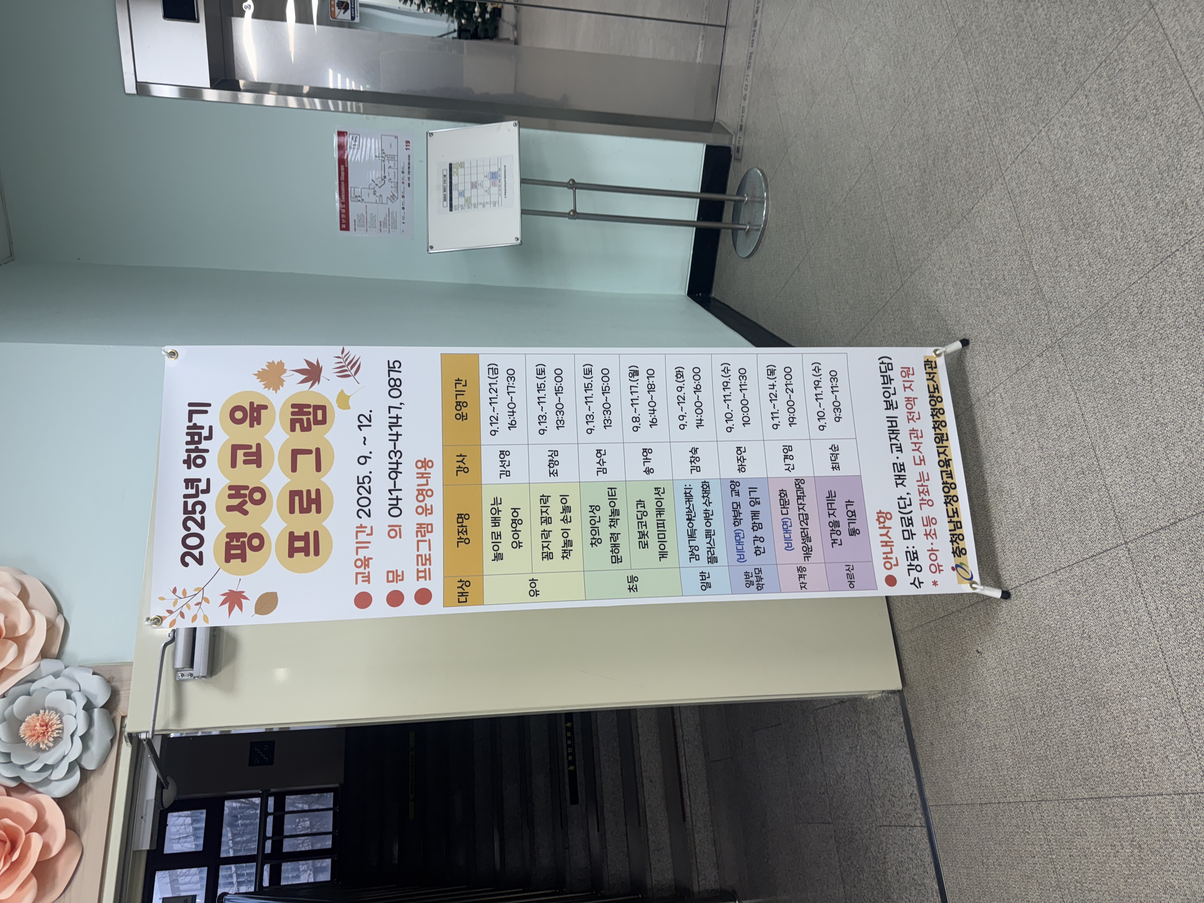 입구에는 평생교육 프로그램 안내판도 세워져 있어요. 유아부터 성인까지 누구나 참여할 수 있는 강좌들이 마련되어 있고, 대부분 무료로 운영됩니다. 그만큼 이 도서관이 지역 주민의 삶 가까이에 있다는 뜻이겠죠. 책을 읽는 공간을 넘어, 배우고 성장할 수 있는 공간으로 자리 잡고 있다는 것이 느껴집니다.