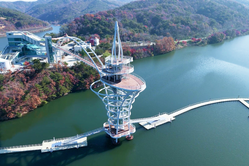 칠갑산의 전설을 표현한 미디어영상관을 비롯한 네가지 테마의 생동감있는 미디어아트와 실감나는 열기구체험, 아이들의 상상력을 자극하는 라이브스캐치, 옥상 포토존에서 청양이와 함께 인증샷을 찍고나면 본격적으로 칠갑호에 더 가까이 갈 준비가 되었을 것이다. 5층에서 스카이워크를 통해 이어지는 57m 높이의 전망대에서 칠갑산의 수려한 산세를 감상하고 수상 엘리베이터를 통해 1층으로 내려가면 수면과 맞닿아있는 수상보행교를 통해 일렁이는 물결과 함께 나만의 산책 시간을 가질수도 있다.